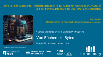 Die 2024 gegründete “AG Historische Ortsdaten” hat es sich zum Ziel gemacht, hier entscheidende Unterstützungsangebote zu schaffen, und neben Hilfestellungen zur Recherche, Verwaltung und Handhabung von historischen Ortsdaten einen Minimaldatensatz erarbeitet, der das kritische Maß an Datenqualität für die Verwaltung historischer Ortsdaten mehrstufig und mit zahlreichen Empfehlungen definiert (https://ortsdaten.hypotheses.org/). Die “Von Büchern zu Bytes”-Session wird einerseits die Arbeit der AG und ihre bereits verfügbaren Angebote vorstellen. In einem Hands-On-Teil sollen die Teilnehmer:innen der Veranstaltung zudem selbst die Gelegenheit erhalten, einzelne Teile der Minimaldatensatzempfehlung zu testen und in den problematischen Umgang mit Ortsdaten einzutauchen, um abschließend Wünsche und Feedback an die AG weiterzugeben.